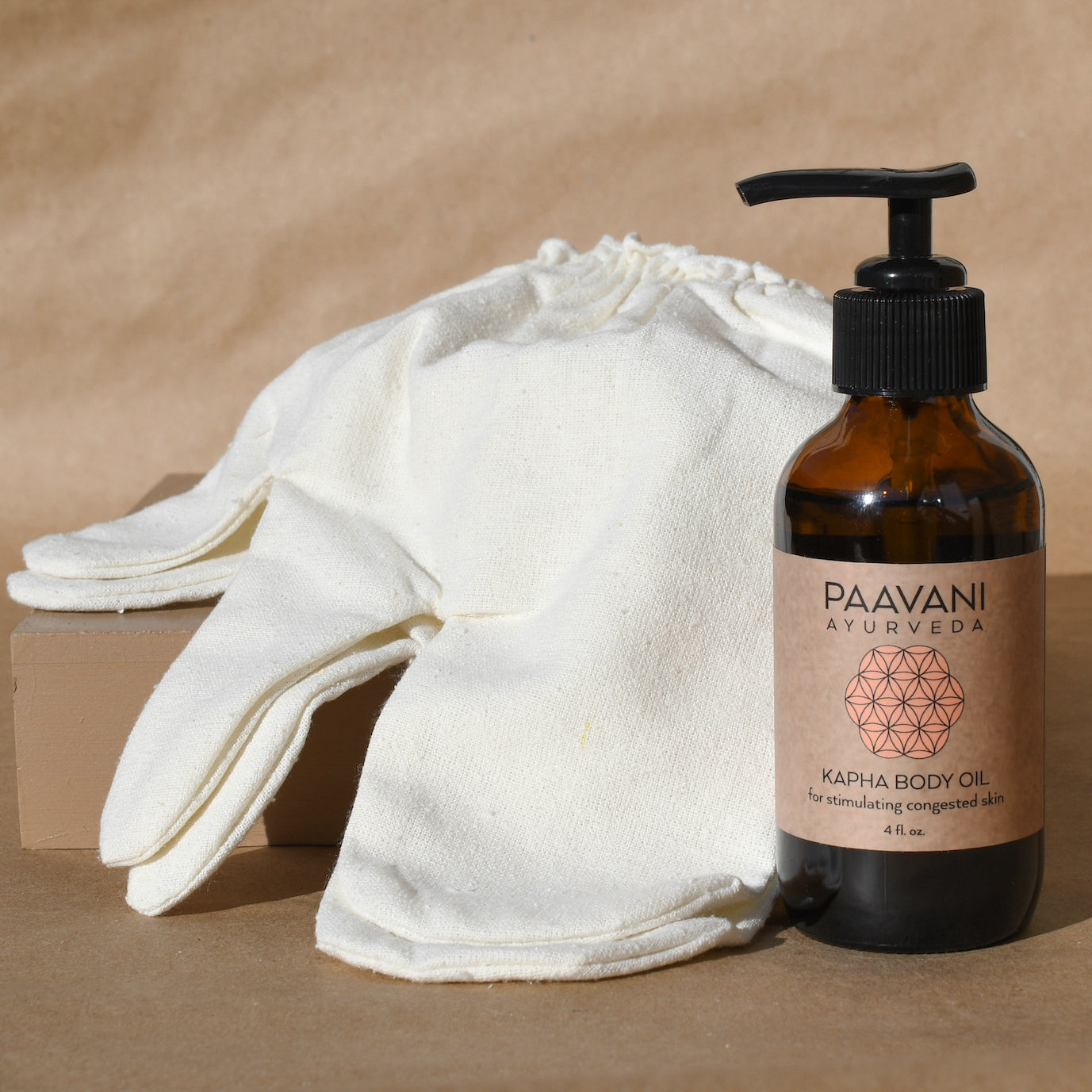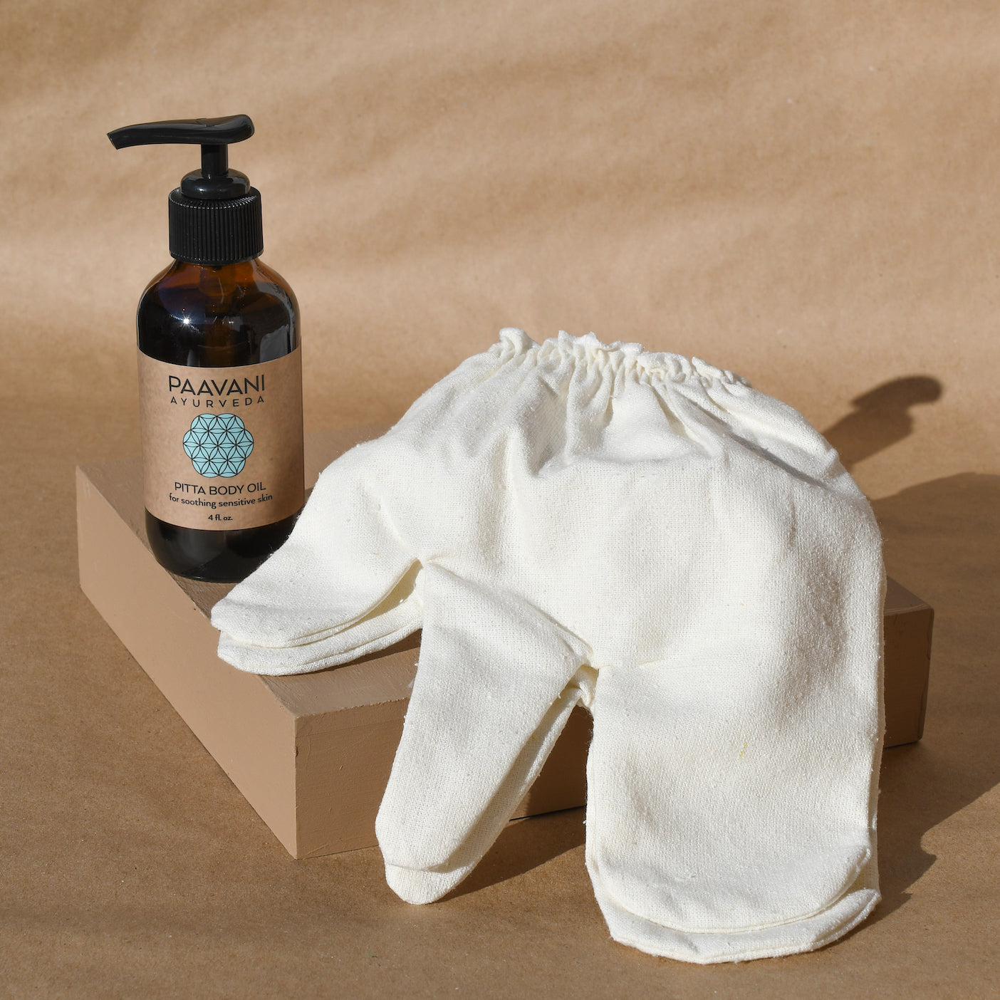 Detoxify your way to radiant, energized skin with the time-honored Ayurvedic rituals of garshana (dry brushing) & abhyanga (herbal oil massage). The Detoxed Skin Stack combines our raw silk Garshana Gloves with your choice of Body Oil to help clear stagnation, stimulate lymph flow & reveal smooth, glowing skin.